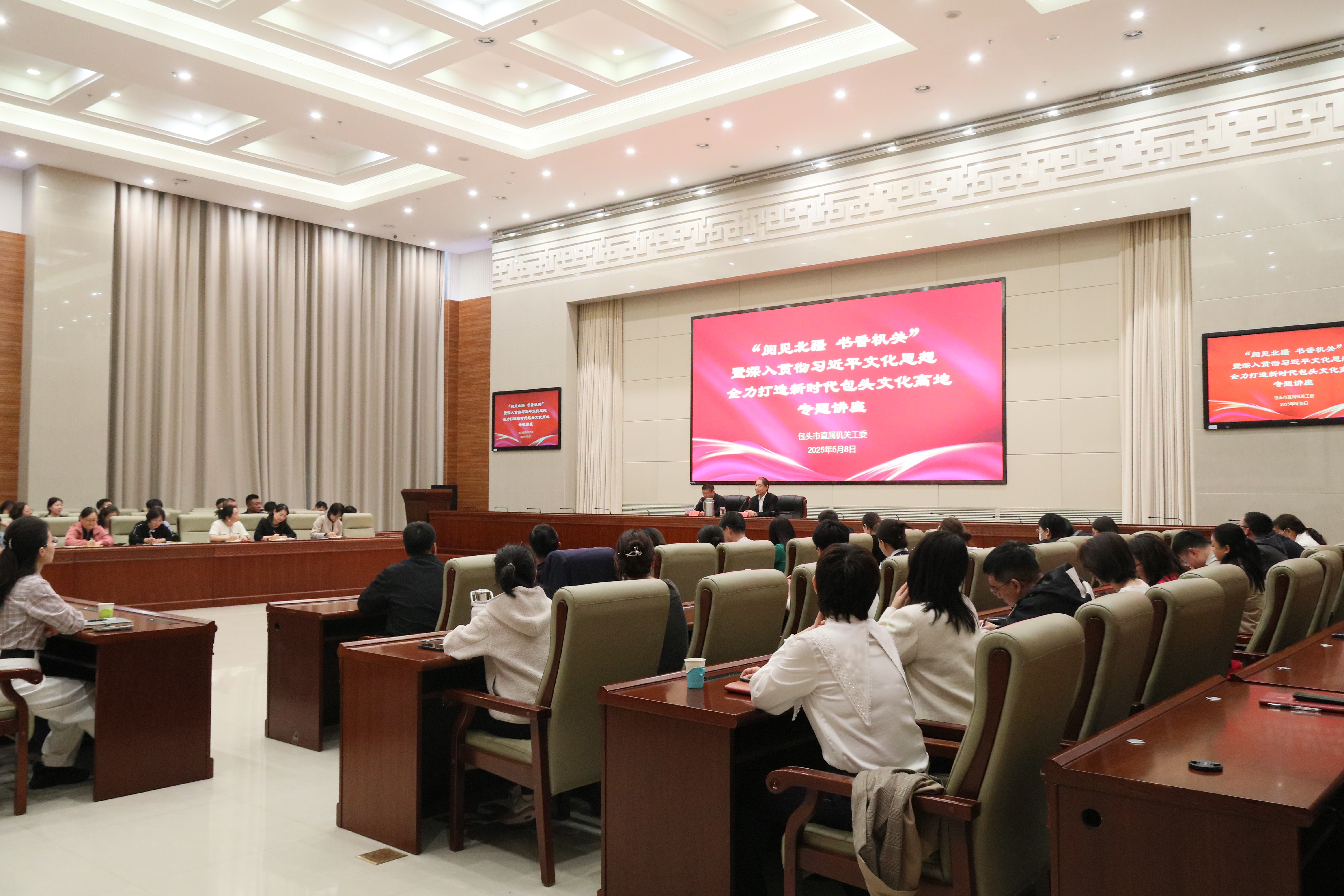 为深入学习贯彻习近平文化思想,大力弘扬北疆文化,进一步加强学习型机关建设,教育引导市直机关党员干部坚持铸牢中华民族共同体意识,坚定文化自信、凝聚奋进力量,按照第十六个党员干部读书月活动安排,5月8日,市直机关工委举办“阅见北疆·书香机关”暨深入贯彻习近平文化思想 打造新时代包头文化高地专题讲座,市直机关100余名党员干部聆听讲座。